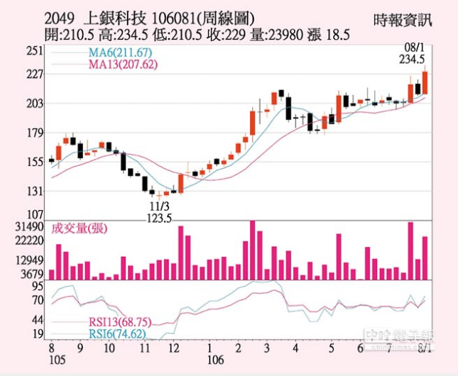 上銀科技(2049)因大陸企業(yè)對(duì)智慧自動(dòng)化及機(jī)器人需求持續(xù)增溫而受益,法人預(yù)期,上銀第2季EPS優(yōu)于首季1.04元,7月合并營收超越6月,上看18億元,續(xù)創(chuàng)單月營收歷史新高,上周五三大法人合計(jì)賣超270張,以平盤229.0元作收,創(chuàng)2015年6月中以來新高,周漲幅8.79%。