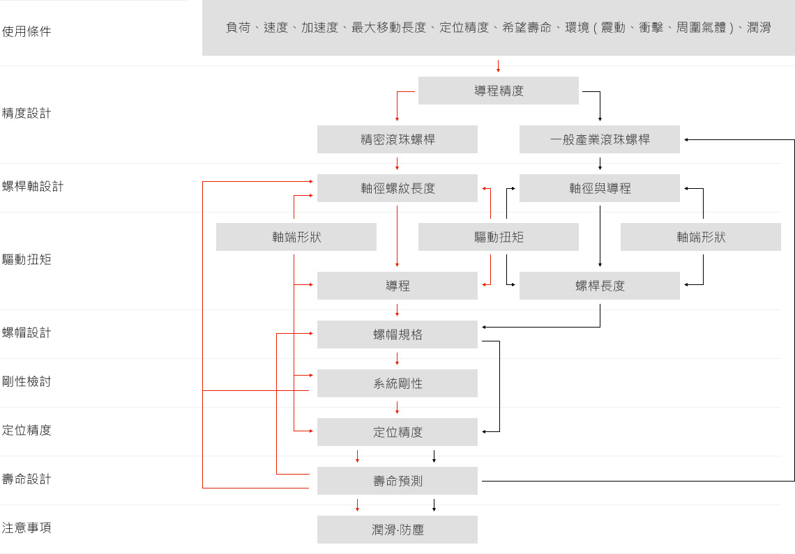 負(fù)載負(fù)荷大小、運(yùn)行速度、最高加速度、最大行程、定位精度、預(yù)期產(chǎn)品壽命、周圍環(huán)境(多塵、潮濕、真空等)、潤(rùn)滑方式