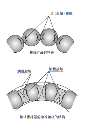 使用球保持器消除了鋼球之間的碰捶唉咅。此外. 因?yàn)殇撉蚴且郧芯€(xiàn)方向排列的.由鋼球循環(huán)引起 的碰撞噪?yún)鹨惨驯幌?/span>