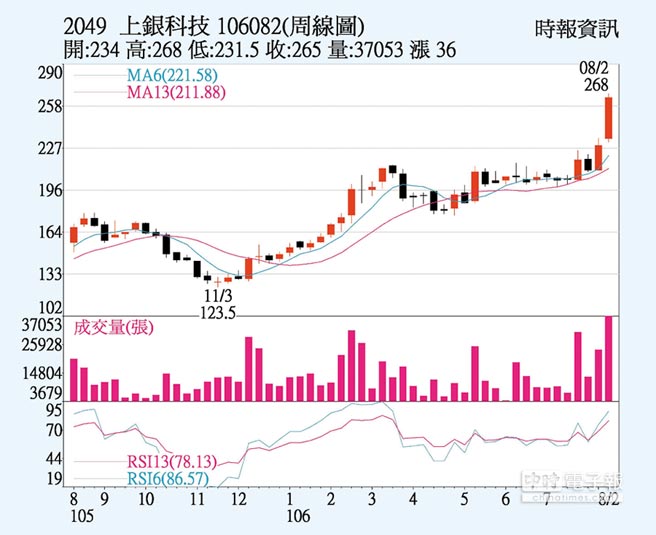 上銀(2049)第2季認(rèn)列匯兌收益1.3億元,EPS達(dá)2.58元,創(chuàng)近10季新高。法人預(yù)期第3季新臺(tái)幣匯率不再升值,第3季毛利率將優(yōu)于第2季,外資券商預(yù)估,今年EPS比去年增加2%~3%,上周五收盤(pán)價(jià)265元,逆勢(shì)大漲18.5元,股價(jià)創(chuàng)2015年4月以來(lái)新高,周漲幅15.72%。