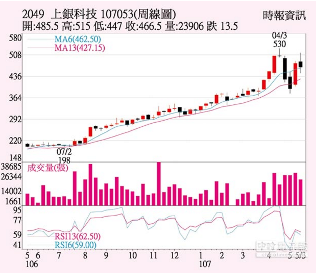 上銀大廠(hiwin)來自半導體、汽車、汽車電池、光電及工具機等產(chǎn)業(yè)訂單持續(xù)增溫,造就第1季EPS攀升至4.34元,創(chuàng)單季新高。法人預期,上銀新廠陸續(xù)啟用,5月合并營收將優(yōu)于4月,續(xù)創(chuàng)單月新高。上周五上漲9元、收466.5元,突破月線及季線反壓,周跌幅2.81%。