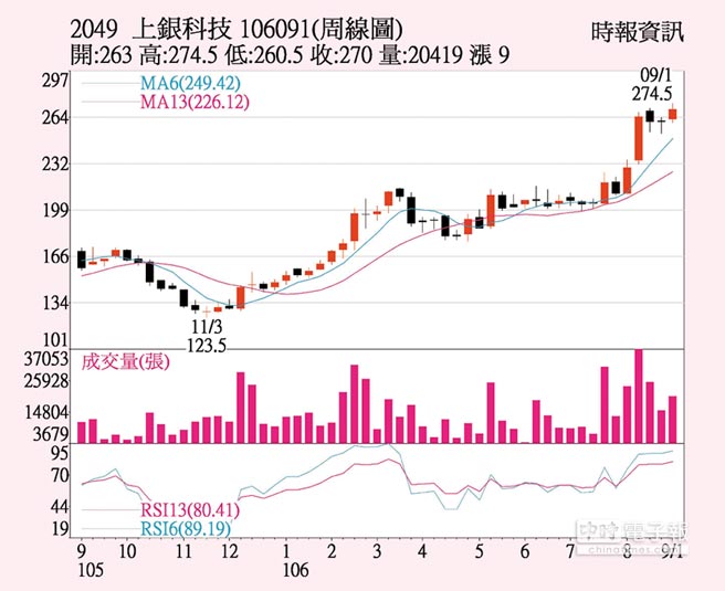 上銀科技(2049)直線導軌及滾珠螺桿等關鍵零組件明年首季訂單滿載,大陸蘇州新廠延后完工加入量產行列,產能吃緊。法人預期,上銀第3季合并營收年增2成多,EPS上看2.6元,全年EPS挑戰(zhàn)8.5元以上。上周五股價上漲2.5元,收270.0元,周漲幅3.45%。