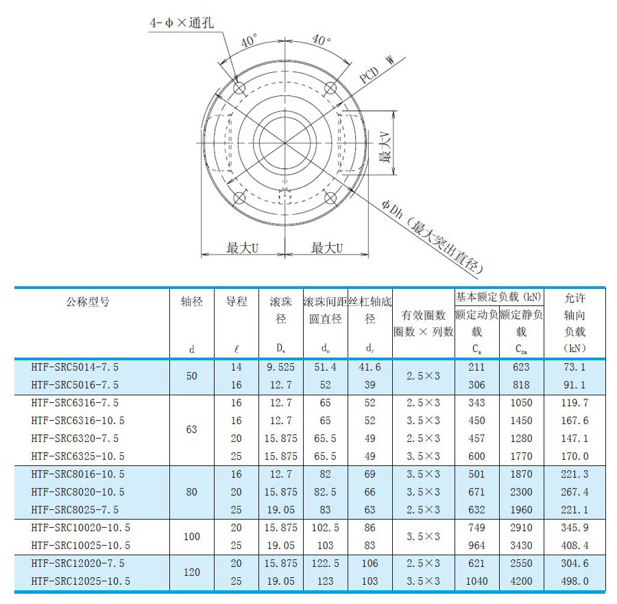 大負(fù)載驅(qū)動(dòng)用HTF-SRC 型特點(diǎn):高速傳送、靜音由于采用循環(huán)方式SRC,比HTF 型的傳送速度提高2 倍以上(d·n 界限值14 萬、16 萬),噪音水平降低8 ~ 10dB(1/2 ~ 1/3 的噪音)。精度等級(jí)、軸向間隙 標(biāo)準(zhǔn)精度等級(jí)、軸向Ct7,S:0.020mm 以下、N:0.050mm 以下。希望使用其他精度的請(qǐng)與NSK 協(xié)商。滾珠保持架S1采用在鋼球間加入樹脂制作的保持架S1 型號(hào),大幅度提高了對(duì)于扭矩負(fù)載的耐久性。單側(cè)統(tǒng)一循環(huán)路徑配置的型號(hào)和為了提高負(fù)載容量改變回循環(huán)路數(shù)請(qǐng)與凡一商城或凡一導(dǎo)軌商城協(xié)商。設(shè)計(jì)上的注意事項(xiàng):HTF-SRC 型是作為大負(fù)載驅(qū)動(dòng)用,對(duì)螺母內(nèi)的負(fù)載分布進(jìn)行了均一化設(shè)計(jì)。為發(fā)揮這個(gè)特性。此外,在高負(fù)載和小沖程等嚴(yán)酷條件下使用滾珠絲杠時(shí),依據(jù)使用條件由NSK 詳細(xì)分析。在設(shè)計(jì)絲杠軸軸端時(shí)如不將軸的一端鉆通、不將軸端尺寸設(shè)計(jì)為小于滾珠溝槽底徑,將無法組裝螺母,請(qǐng)留意。